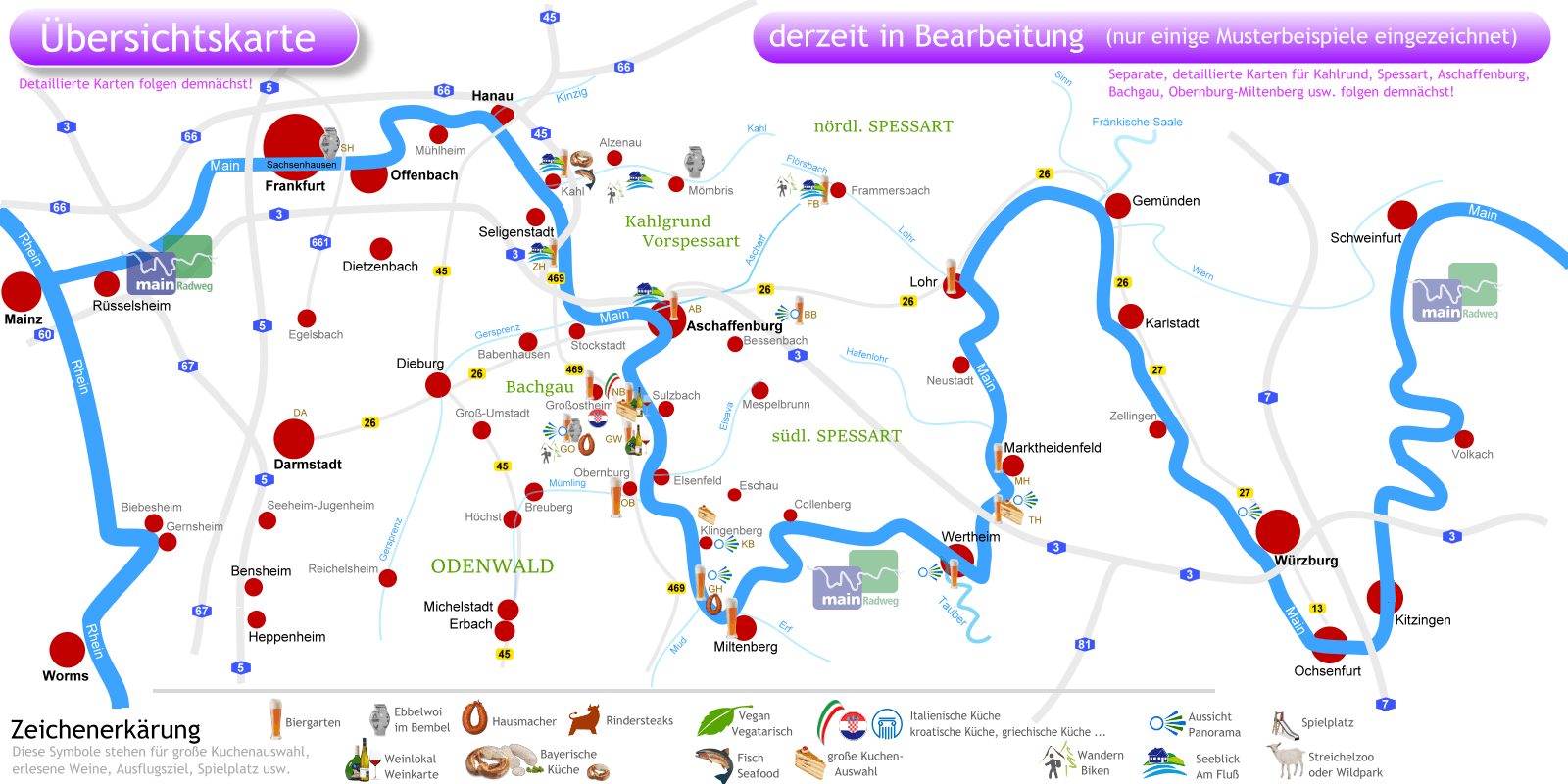 Für Wanderfreunde und Radler sind Biergärten, welche direkt an ausgeschilderten Wanderwegen, am Main-Radweg oder an MTB-Trails liegen, mit Symbolen markiert.